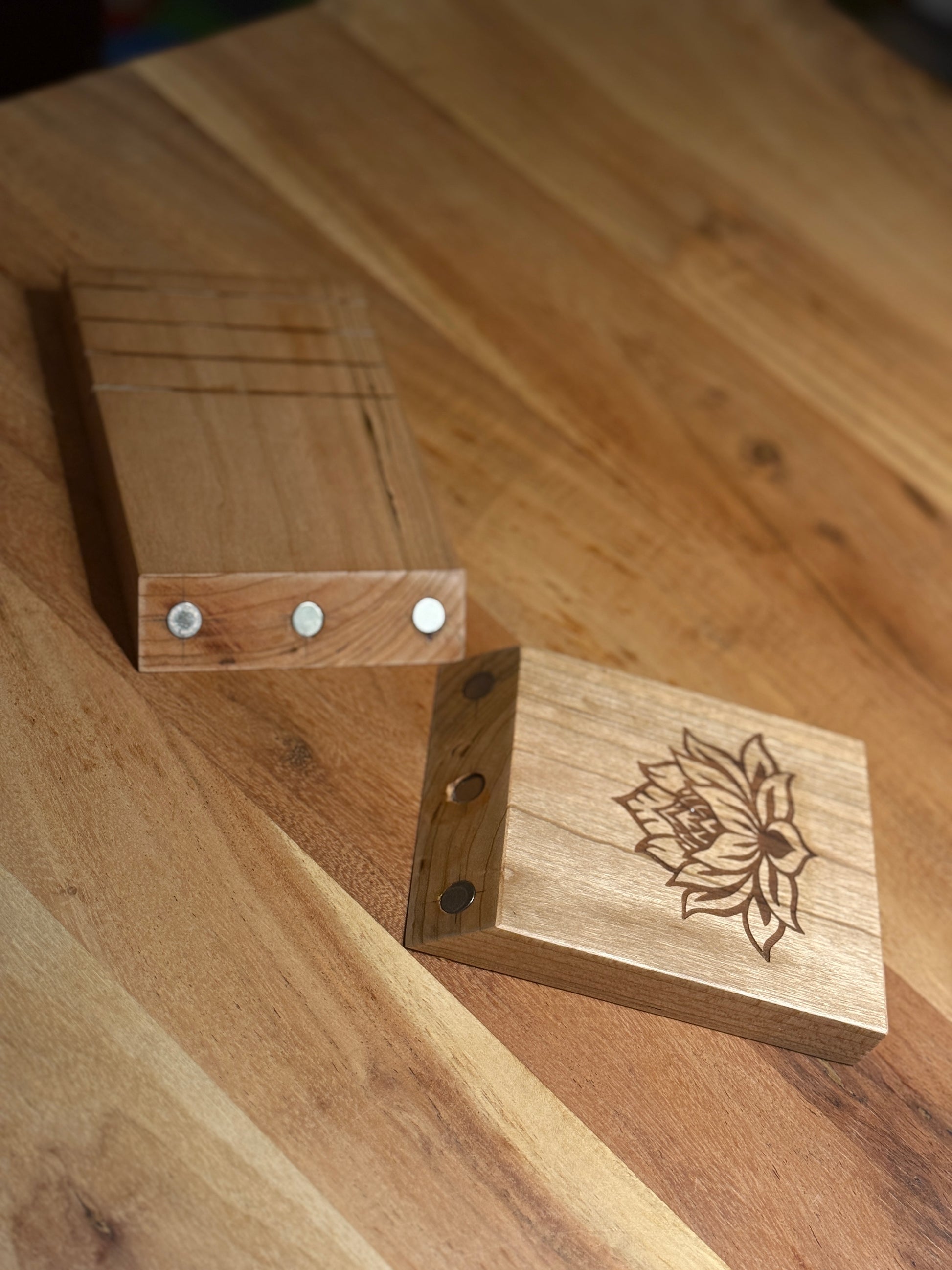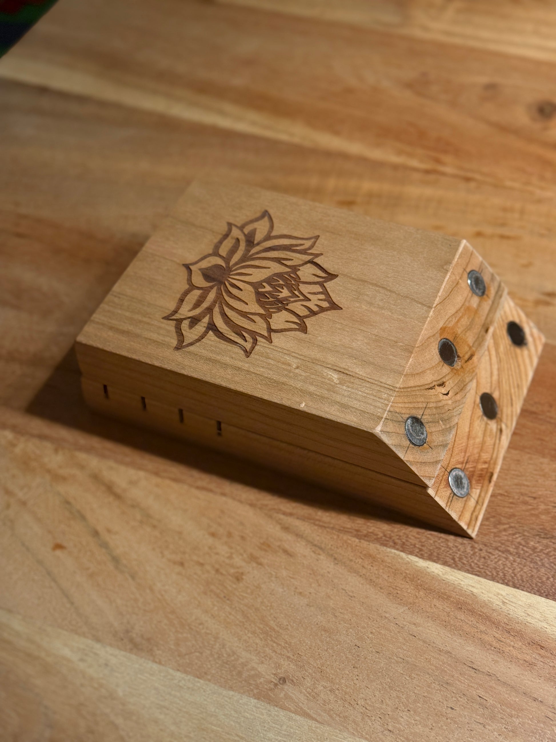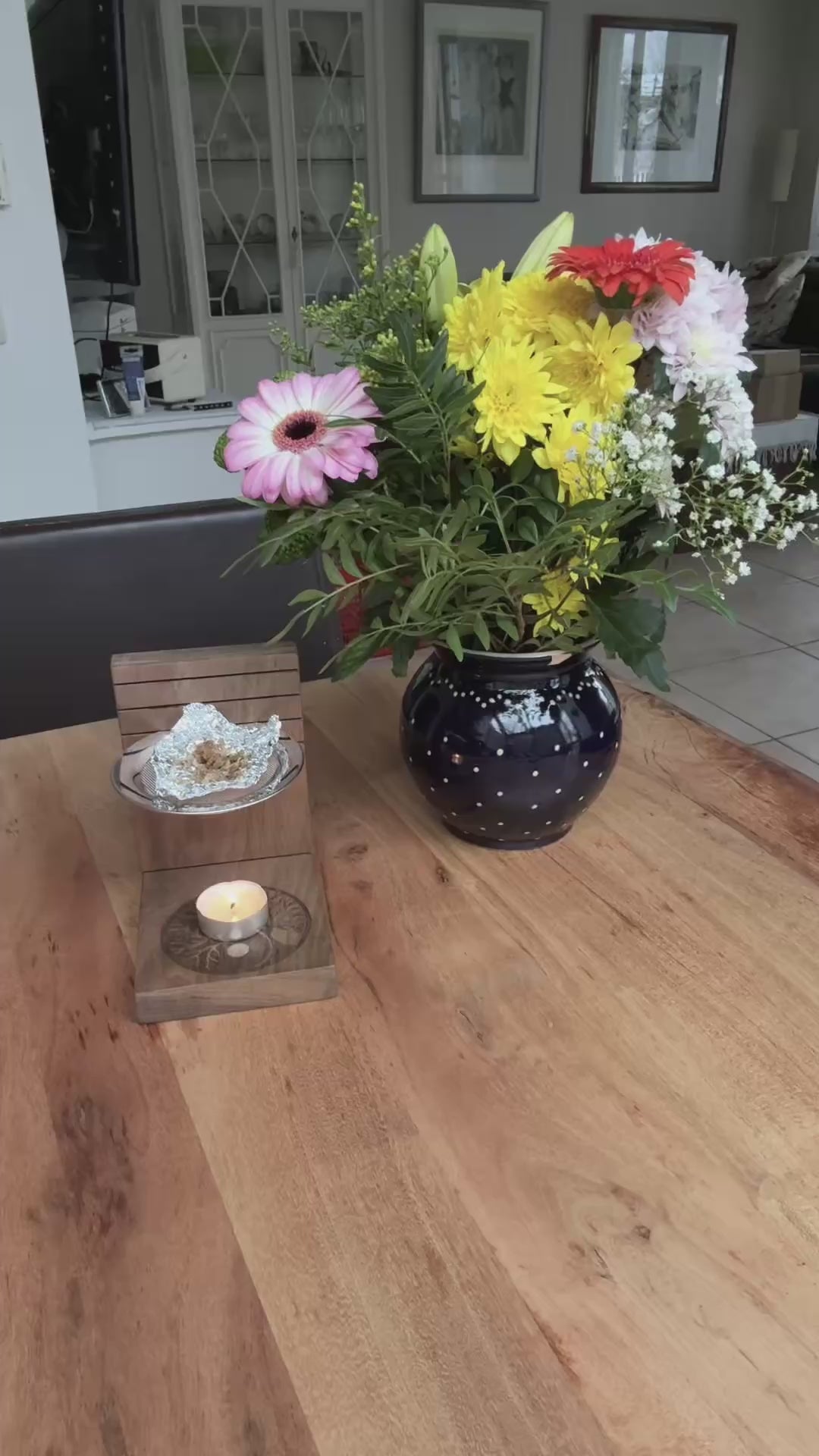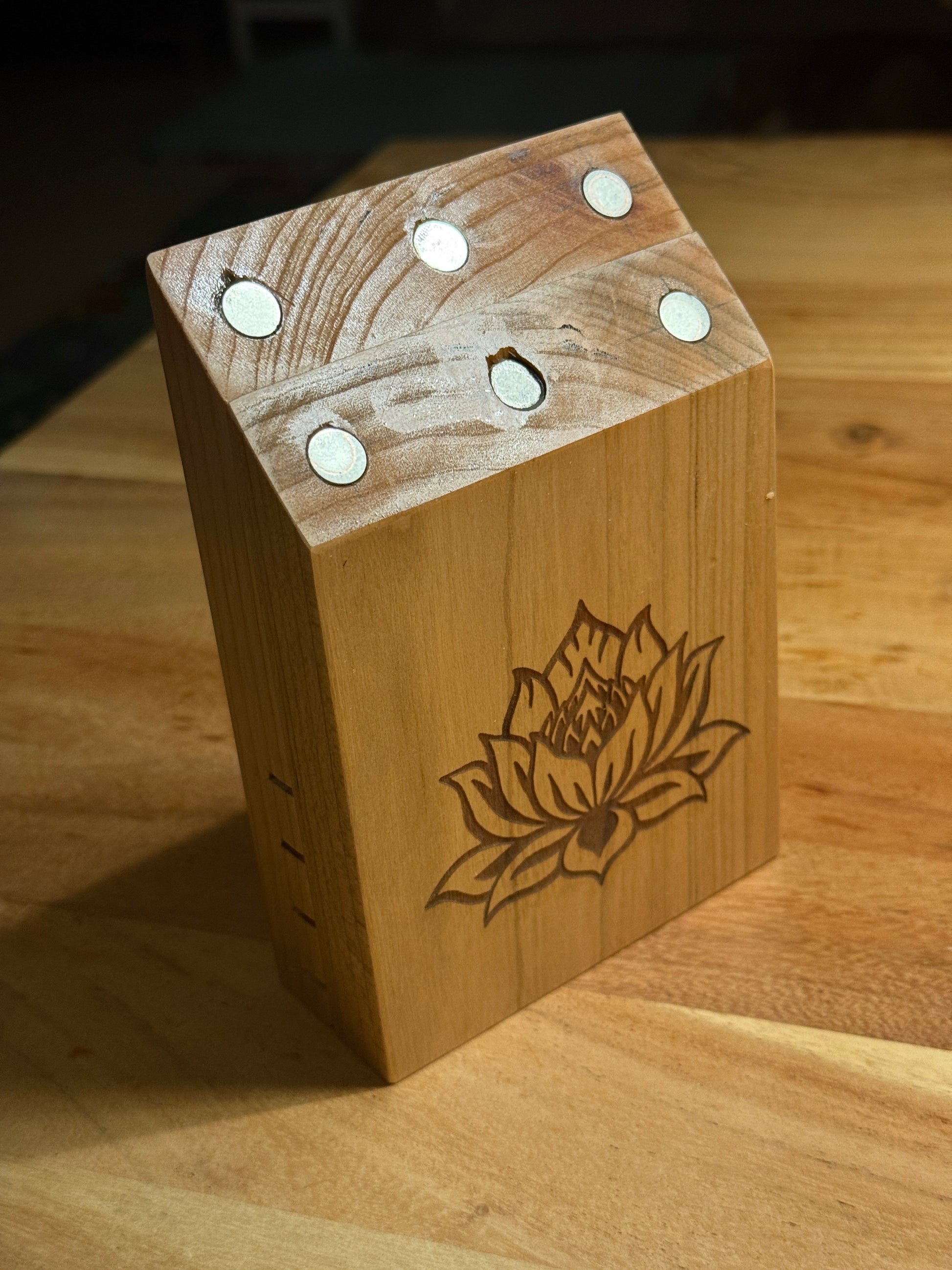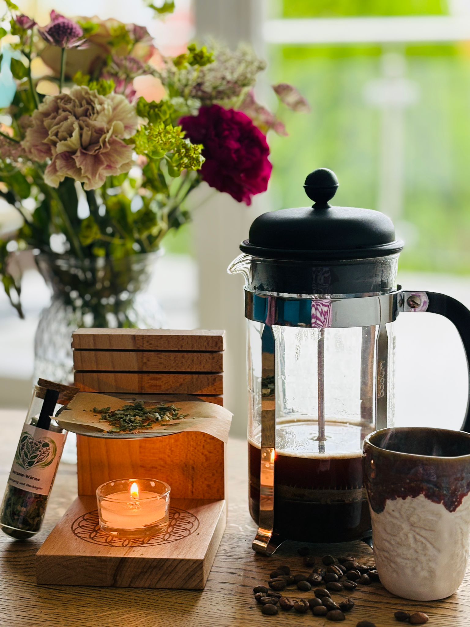 Das Stövchen ist wundervoll mit der Blume des Lebens (oder anderen Motiven wie dem Yin Yang Baum) verziert (eingebrannt in das Bodenholz).